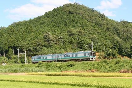 青郷駅の駅前の坂道を降りて、右折し歩くと、右手に田んぼと線路が見える。そこの田んぼの畦道から撮る。徒歩3分